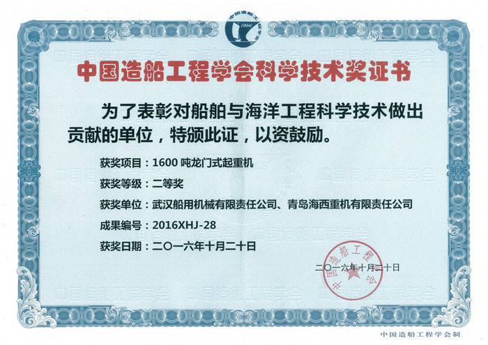 近日,中國造船工程學(xué)會傳來喜訊,我司《1600噸龍門式起重機(jī)》榮獲科學(xué)技術(shù)二等獎。這是青島海西重機(jī)在船舶與海洋工程領(lǐng)域獲得的又一項(xiàng)具有較高影響力的榮譽(yù)。