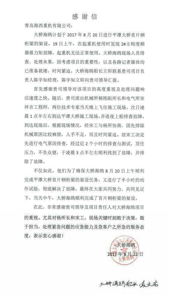 自今年年初設(shè)備交付以來,海西重機(jī)定期安排技術(shù)人員進(jìn)行回訪,協(xié)助業(yè)主方對(duì)設(shè)備進(jìn)行檢查和保養(yǎng),及時(shí)處理故障,保證設(shè)備高效運(yùn)作,有力地保障了現(xiàn)場(chǎng)施工的可靠性和穩(wěn)定性,海西重機(jī)工作人員負(fù)責(zé)、用心的工作態(tài)度和完善的售后服務(wù)得到了業(yè)主方的一致好評(píng),業(yè)主特發(fā)來感謝信給予表揚(yáng)。