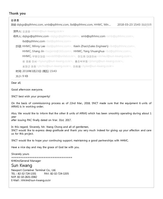 3月21日,海西重機(jī)(HHMC)為韓國(guó)鮮光新港集裝箱碼頭有限公司(SNCT)制造的6臺(tái)40噸自動(dòng)化軌道吊順利交付投產(chǎn)。