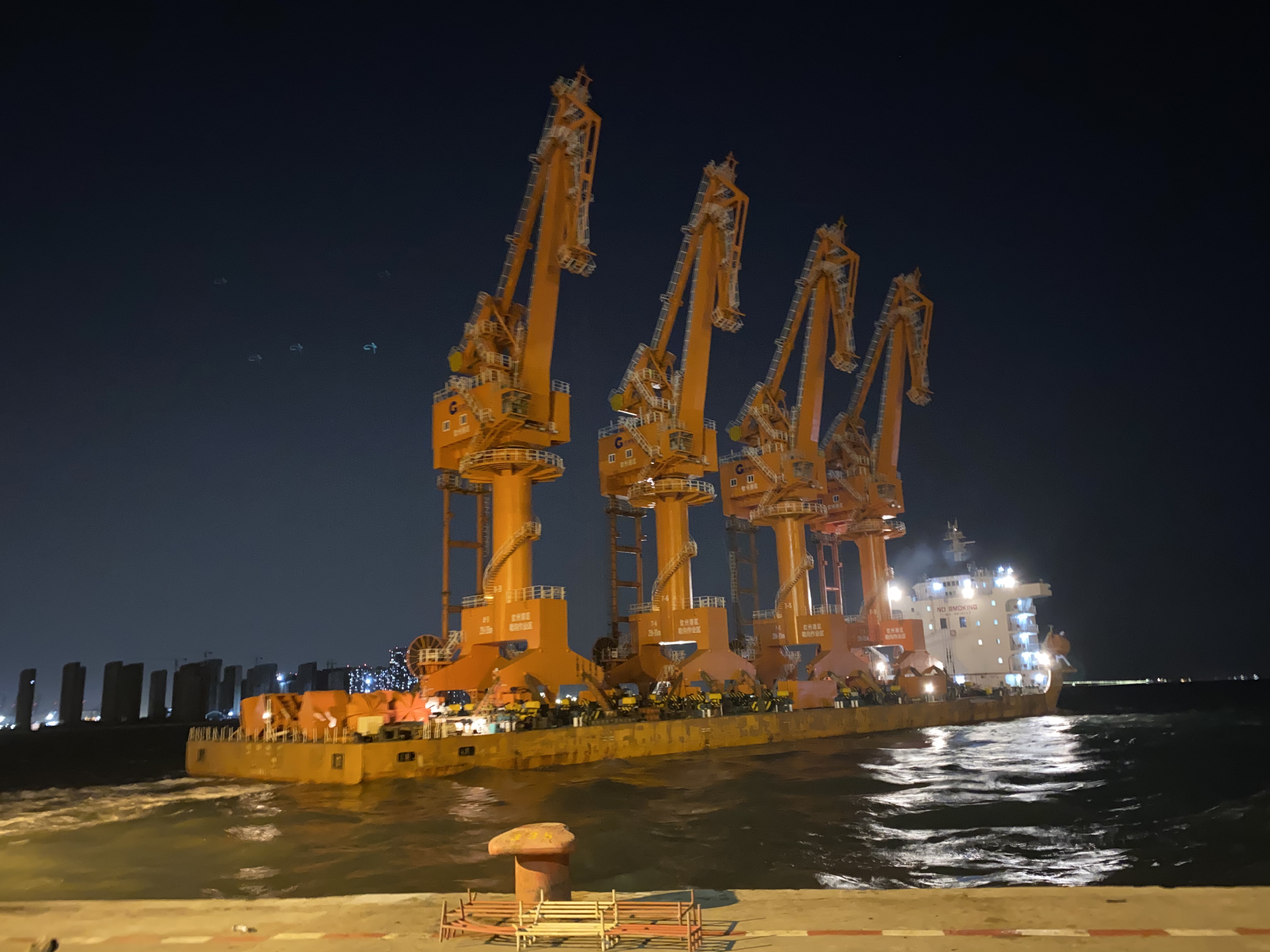 本項目的4臺門機為四連桿門座式起重機,配置吊鉤、抓斗,吊鉤工況最大起重量40噸,抓斗工況最大起重量25噸,工作幅度35米,可用于鐵礦石、煤、鎳礦、糧食等散貨以及件雜貨的裝卸作業(yè),主要用于北部灣港勒溝作業(yè)區(qū)7-8#泊位碼頭。設備投產(chǎn)后將大幅提高碼頭的作業(yè)能力,有效解決7-8#泊位門機分布不足的問題。