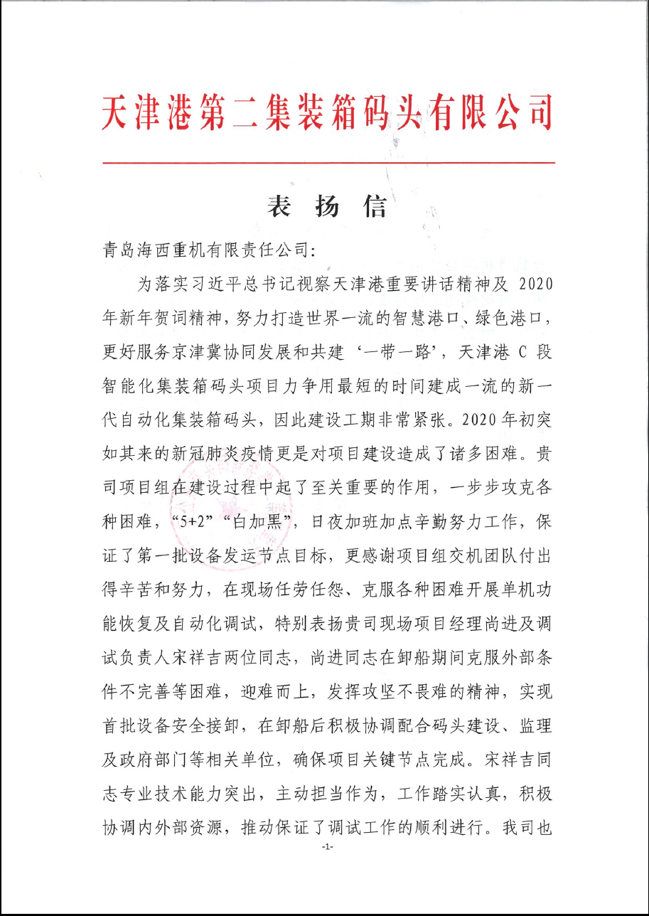 該項(xiàng)目第一批設(shè)備的發(fā)運(yùn)正值彼時(shí)天津疫情嚴(yán)重之際,海西重機(jī)項(xiàng)目組交機(jī)團(tuán)隊(duì)更是不畏艱難,勇于擔(dān)當(dāng)作為,馬上奔赴新的戰(zhàn)場(chǎng)。用戶在表?yè)P(yáng)信中,特別表?yè)P(yáng)了海西重機(jī)現(xiàn)場(chǎng)項(xiàng)目經(jīng)理尚進(jìn)和調(diào)試負(fù)責(zé)人宋祥吉。尚進(jìn)同志在卸船期間克服外部條件不完善等困難,迎難而上,發(fā)揮攻堅(jiān)無(wú)畏的精神,實(shí)現(xiàn)首批設(shè)備安全裝卸,在卸船后又積極配合碼頭建設(shè)、監(jiān)理及政府部門等相關(guān)單位,力保項(xiàng)目關(guān)鍵節(jié)點(diǎn)的完成。