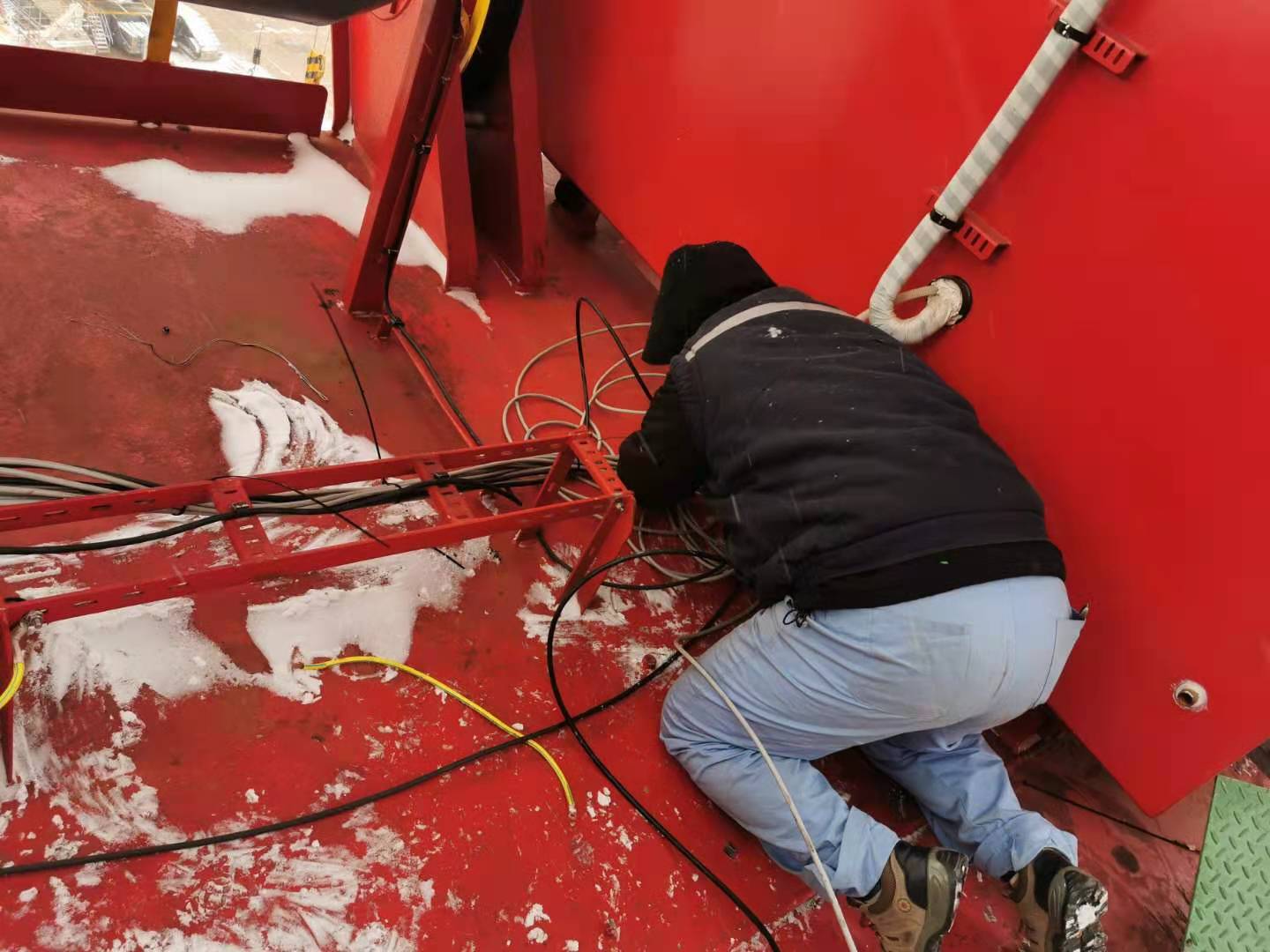 20201231日開始,為了追趕進度,我們團隊頂著冷風(fēng),放棄休息時間,把臂架到機房、司機室、電氣房的電纜敷設(shè)下來,進行捆扎。為了與船廠穿鋼絲錯開,吃飯的時間點總是往后推遲。甚至為了節(jié)省時間,自己提前帶好面包,中午簡單吃點,為的就是把工作搶一搶,看著已經(jīng)穿到位的電纜,不禁感嘆隊友們的拼勁兒。