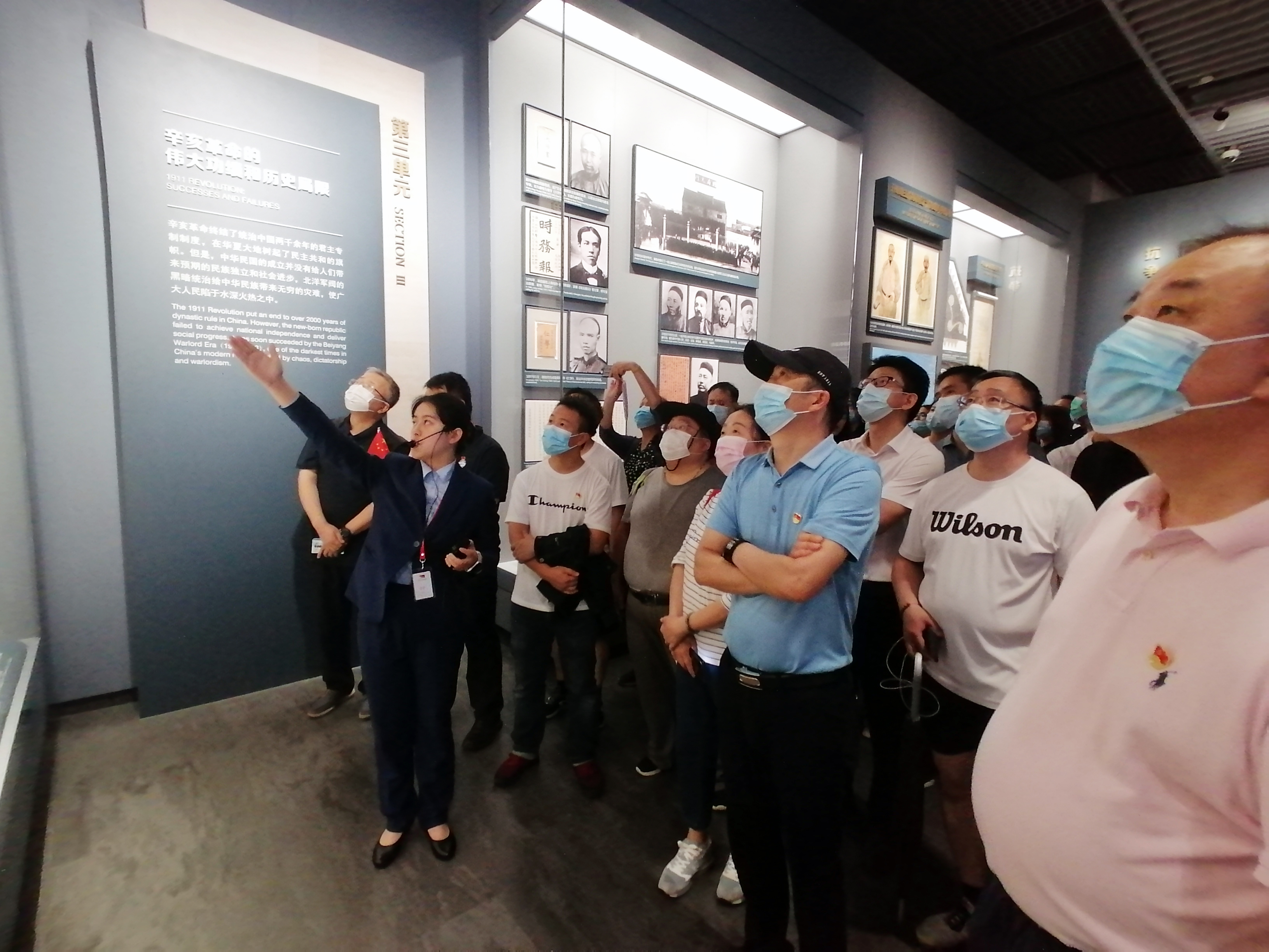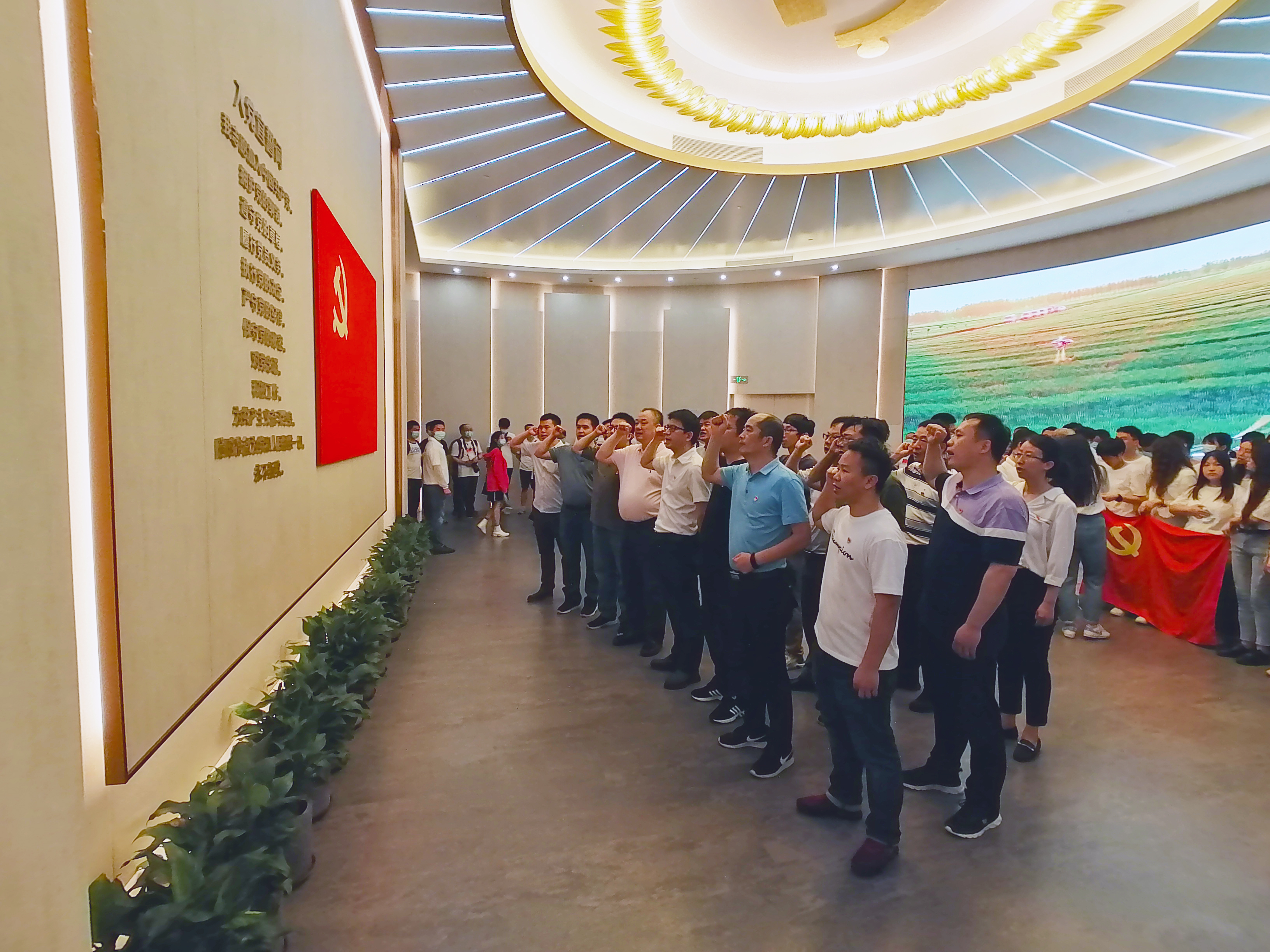 走進紀念館,映入眼簾的是一個巨幅瓷板畫《日出東方——從石庫門到天安門》,畫面中容納了一大會址、紅船、井岡山、北京天安門等革命圣地元素,反映了中國共產黨由小到大、由弱到強的奮斗歷程。進入序廳,迎接參觀者的是主題雕塑《偉大的開端》,13位一大代表站在石庫門前,向我們展示著他們的堅定信念和激昂的革命情懷。跟隨講解員,沿著展區(qū)布景的脈絡一路參觀了“前仆后繼、救亡圖存”,“民眾覺醒、主義抉擇”,“早期組織、星火初燃”,“開天辟地、日出東方”,“砥礪前行、光輝歷程”五個部分,展廳集中呈現了建黨時期的珍貴文獻、照片、實物,并以數字化、智能化的方式,立體重現了中國共產黨建黨初期在上海的革命實踐。大家在銘刻歷史印記的文物實物,內容詳實的刊物、圖片、圖表前駐足,在視頻影像和場景還原處停留,仔細聆聽講解,用心感悟、感知中國共產黨在上海創(chuàng)建的光榮歷史、奮斗歷程。最后,在宣誓大廳,面對鮮紅的黨旗,朱聲凱帶領大家宣誓,一起重溫入黨誓詞。