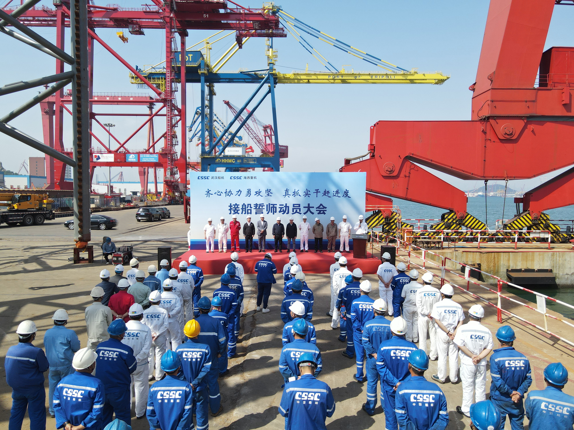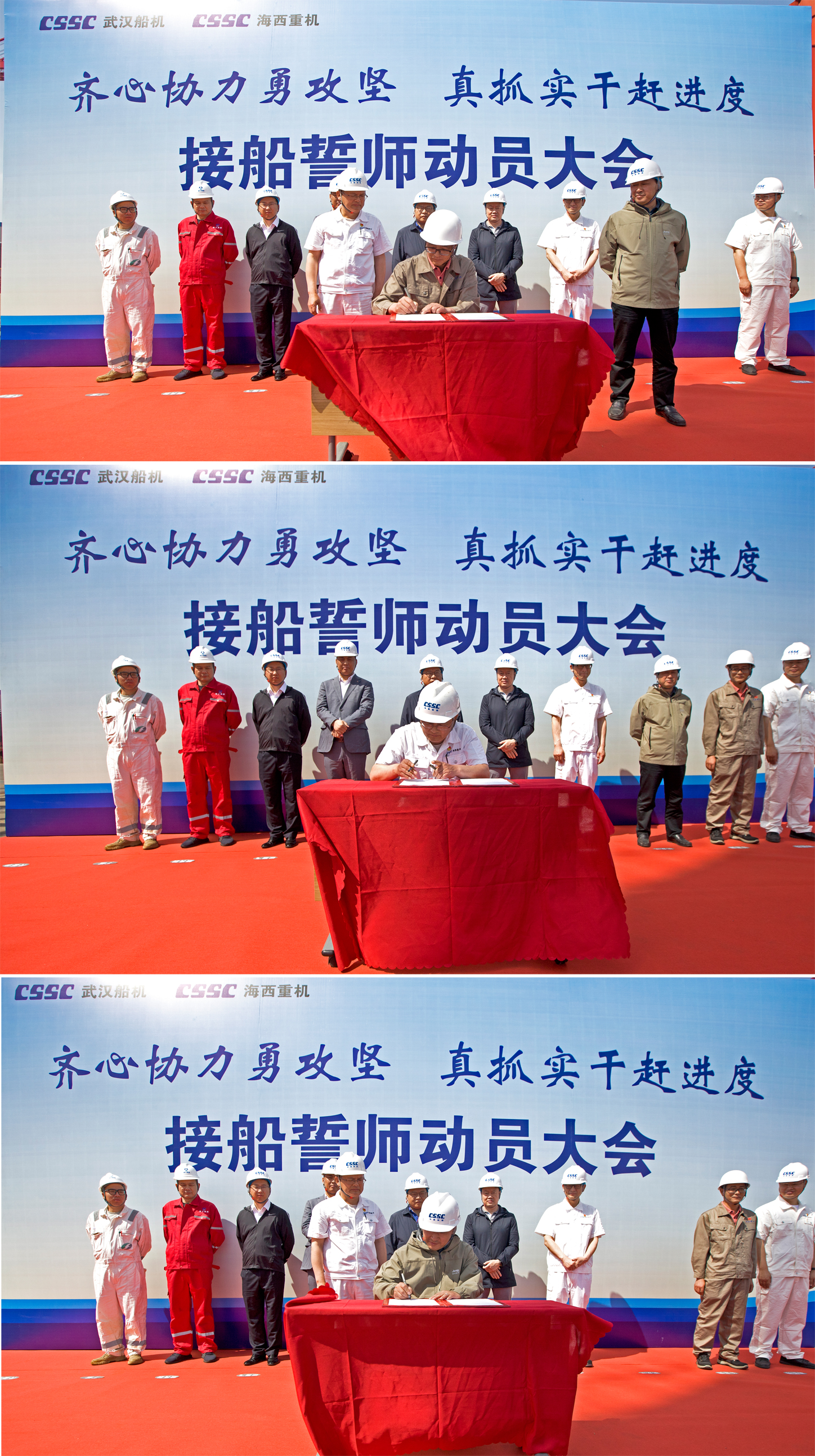為了明確目標(biāo)、凝聚共識、齊心協(xié)力、克難攻堅,亮明迎難而上的堅定信心和堅強決心,動員全員上下持續(xù)營造濃厚干事氛圍,掀起“齊心協(xié)力勇攻堅,真抓實干趕進度”的高潮,全力以赴打好海工項目集中攻堅戰(zhàn),5月25日上午,中國船舶集團旗下武漢船機海西重機公司在生產(chǎn)現(xiàn)場組織開展接船誓師動員大會。華夏金融租賃有限公司、北京神大集團有限公司、飛勵特船舶管理有限公司、大津重工泰州分公司、江陰雙馬重工裝備有限公司、武漢船機海西重機等相關(guān)方參加本次動員大會。