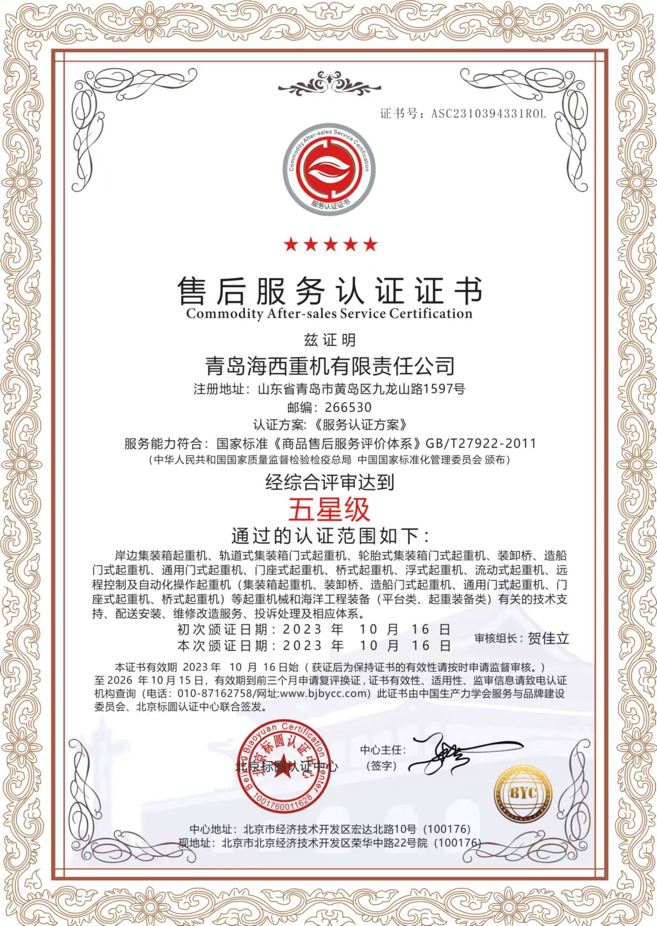 通過售后服務(wù)體系認(rèn)證,是對(duì)海西重機(jī)品質(zhì)追求和服務(wù)能力的有力驗(yàn)證。海西重機(jī)將以此為契機(jī),繼續(xù)提升服務(wù)質(zhì)量,為每一位客戶提供更優(yōu)質(zhì)、更高效、更全面的服務(wù),為客戶創(chuàng)造更大的價(jià)值。