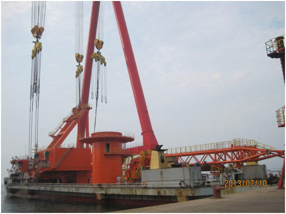 G127項目為一臺350t固定式回轉(zhuǎn)起重機,最大件重約350t,只能由公司的1600T龍門吊同時配合兩件250T吊梁進行吊裝裝船工作。因公司突堤碼頭港池有效寬度約為85米,且港池內(nèi)部已經(jīng)停靠一艘寬度為48米的3600T浮吊船只,因而留給G127項目靠船的空間非常有限。經(jīng)過我部與船上技術(shù)人員反復測量和商議方案,最終采取尾靠方案,于7月9日在成功避開了3600T浮吊船只錨點后,順利??吭诟鄢貎?nèi)指定地點,并于近日完成了全部吊裝加固工作。
